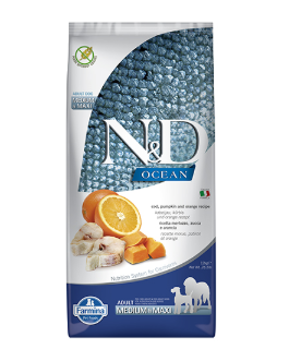 Без зърнени култури, с високо съдържание на животински съставки , 96% протеин от животински произход, и тиква , зеленчук с уникални хранителни свойства. Farmina N and D Pumpkin Codfish and, Orange е пълноценна храна за кучета от средни и едри породи в зряла възраст с риба треска, тиква и портокал, формулирана така, че да отговаря на хранителните нужди, установени от AAFCO за всички етапи от живота на кучето.