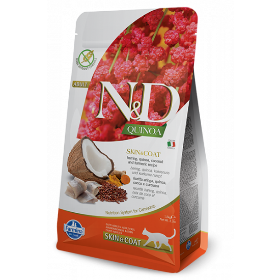 Прясна диво уловена херинга (18%), дехидратирана херинга (18%), скорбяла от грах, рибено масло (от херинга), семена от киноа (8%), ленено семе, сушен кокос (2.5%), куркума (2.5%), инулин, фрукто-олигозахариди, екстракт от мая (източник на мано-олигозахариди), псилиум, калциев карбонат, дикалциев фосфат, cкалциев фосфат дихидрат, калиев хлорид, натриев хлорид, суха бирена мая, глюкозамин, хондроитин сулфат. Източници на протеин: прясна диво уловена херинга, дехидратирана херинга, екстракт от невен (източник на лутеин).