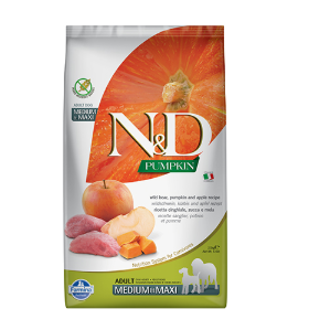 Глиганско, тиква и ябълка. Пълноценна храна за кучета в зряла възраст. Състав: Прясно обезкостено глиганско (24%), дехидратирано глиганско месо (22%), скорбяла от грах (20%), дехидратирана тиква (5%), дехидратирани цели яйца, рибено масло, растителни фибри от грах, сушени моркови, сушена люцерна, инулин, фрукто-олиго-захариди, мано-олиго-захариди, сушена ябълка (5%), спанак на прах, псилиум (0.3%), нар на прах, касис на прах, сладък портокал на прах, боровинки на прах, натриев хлорид, сушена бирена мая, куркума (0.2%), глюкозамин, хондроитин сулфат, екстракт от невен (източник на лутеин), добавки и витамини (виж опаковката). Аналитичен състав: Протеини: 30.00%, Масла и мазнини: 18.00%, Фибри: 2.90%, Пепел: 6.60%, Калций: 1.20%, Фосфор: 0.90%, Омега‐6: 3.30%, Омега‐3: 0.90%, DHA: 0.50%, EPA: 0.30%, Глюкозамин: 1200mg/kg, Хондроитин: 900mg/kg. Произведено със съставки предимно от Италия, Дания и Франция.