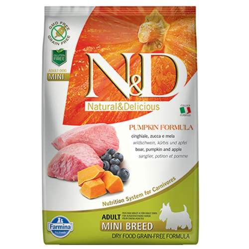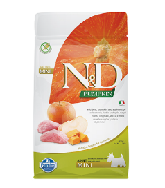 Farmina N and D Pumpkin Boar and, Apple е пълноценна храна за кучета от дребни породи в зряла възраст с глиганско, тиква и ябълка, формулирана така, че да отговаря на хранителните нужди, установени от AAFCO за всички етапи от живота на кучето. Храната е без зърнени култури с високо съдържание на животински съставки (над 60%) и зеленчук – тиква, с уникални хранителни свойства.