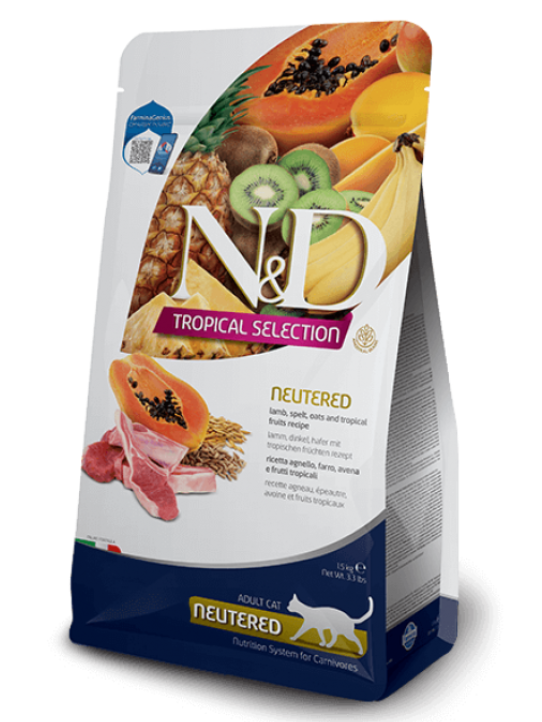 N&D Tropical Selection Neutered Adult Cat Lamb and Tropical fruits – суха храна за кастрирани котки над 1 година с агнешко, спелта, овес и тропически плодове