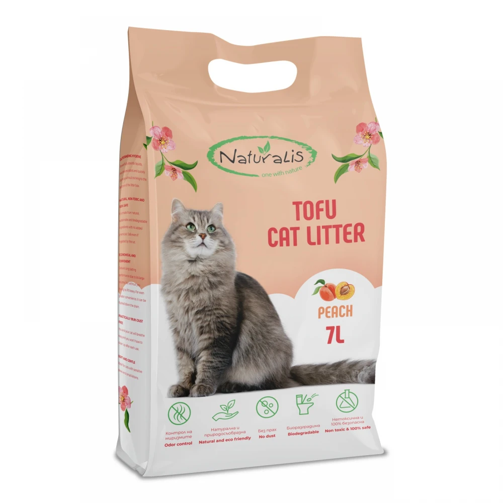 Бъдете едно с Майката Природа или поне направете един избор в нейна полза! Naturalis Tofu Cat Litter е 100% биоразградима котешка тоалетна на основата на соя с мек аромат. Този уникален продукт е направен от неразтворимите части на соево зърно, които се получават след производството на соеви продукти. Обикновено тези неразтворими части се изхвърлят, но Naturalis въвежда втора цел за този „отпадъчен“ материал, превръщайки го в изключителна котешка тоалетна с невероятни абсорбиращи свойства. Този природосъобразен продукт сформира здрави и компактни бучки при контакт с котешката урина, като неутрализира лошите аромати и поддържа дома Ви чист. Отпадъците могат да бъдат изхвърлени в канала, което прави продукта още по-удобе
