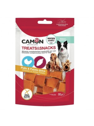 Куче Лакомства за кучета Меки и дъвчащи лакомства Camon Неустоими кубчета с пилешко месо и сладък картоф – 80 гр.