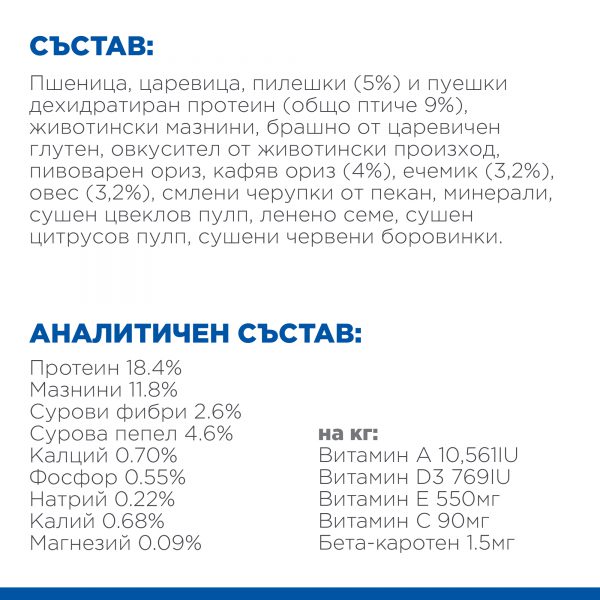 СЪСТАВ: Пшеница, царевица, пилешки (5%) и пуешки протеин (общо птичи 9%), животински мазнини, царевичен глутен, животински овкусител, пивоварен ориз, кафяв ориз (4%), ечемик (3, 2%), овес (3, 2%), смлени черупки от пекан, минерали, сушена цвеклова каша, ленено семе, сушена цитрусова пулпа, сушени червени боровинки.