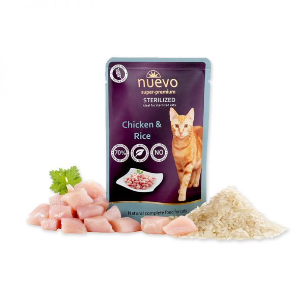 Нуево за &bdquo, Кастрирани&ldquo, котки е вкусна и балансирана храна с редуцирано количество мазнини и добавен L-карнитин, с цел задържане на нормалното тегло. DL-метионинът поддържа оптимална киселинност на урината и предпазва от образуването на уролити.