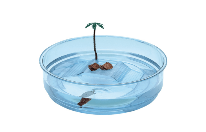 Кръгъл аквариум за костенурки. Направен от здрава прозрачна пластмаса. С малък остров с палма в средата. . Благодарение на диаметъра от около 30 см, може безопасно да се използва и за влечуги. Подходящ за поставяне в ограничени пространства. Островът в средата може лесно да се махне за по-лесна поддръжка.