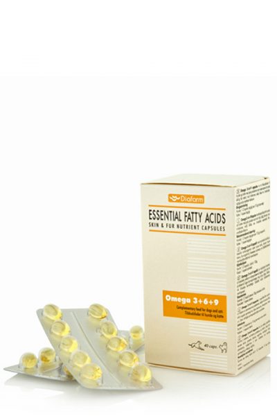 Блистеровани капсули с мастни киселини Омега 3, 6 и 9. Съдържание в една капсула: Категория хранителни добавки Vegetable oil (Borago officinalis, L.), antioxidant. Vegetable oil (Olea europaea L.), Omega 3 oil, Gelatine. Компонентен състав: 375 mg Omega 3 oil: – min. 33% EPA (EicosaPentaenoic Acid) – min. 22% DHA (DocosaHexaenoic Acid) 100 mg Omega 6 oil: – min. 20% GLA (Gamma Linolenic Acid) – min. 34% LA (Linoleic Acid ) 50 mg Omega 9 oil – min. 54% Oleic Acid Аналитичен състав: Суров протеин: 18%; Сурови влакнини;1%; Сурови мазнини: 72%; Сурова пепел:1%; Въглехидрати: 6,5% Видове животни, за които е предназначен: Кучета и Котки. Показания: Омега 3 + 6 + 9 капсули е допълваща храна за кучета и котки с проблеми като: суха кожа, слаб растеж на козината, кожни раздразнения, пърхот, сърбеж и др. Съдържа важни полиненаситени мастни киселини. Дозировка и начин на приложение: Кучета: 1-2 капсули дневно на 10 кг телесно тегло. Котки: 1 капсула дневно. Опаковка: 40 капсули (в блистери).