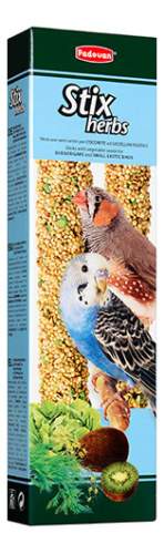 Допълваща храна за вълнисти папагали и екзотични птици. 80 гр (10брв кашон).Ронливи пръчки, изпечени във фурната, със семена от зеленчукови растения, които да се прилагат като допълнение към нормалното хранене на птиците. Състав:зърнени храни,семена (копър 1%, бяла маруля 1%),хлебни изделия, Захари,плодове ,минерални вещества.