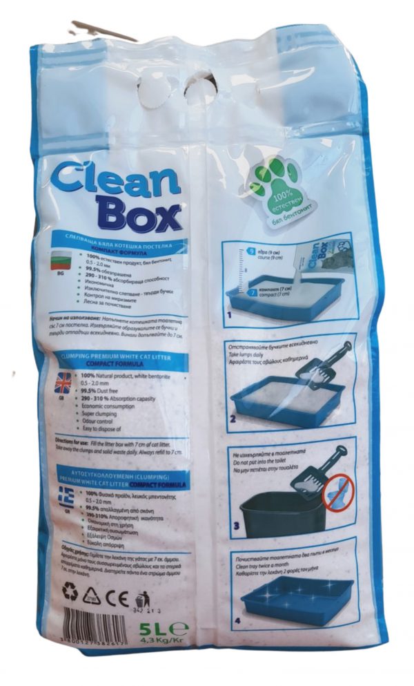 Постелка от бял бентонит – размер “compact” (05-2.00 мм), което означава по-малък размер на гранулите и многократно по-голяма абсорбационна повърхност (абсорбира 300%) в сравнение с масовите котешки тоалетни с размер “cource”.