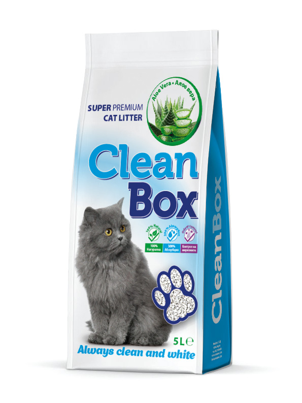 CLEAN BOX Super Premium Алое Вера, постелка за котешка тоалетна, фин бял бентонит, 5 л