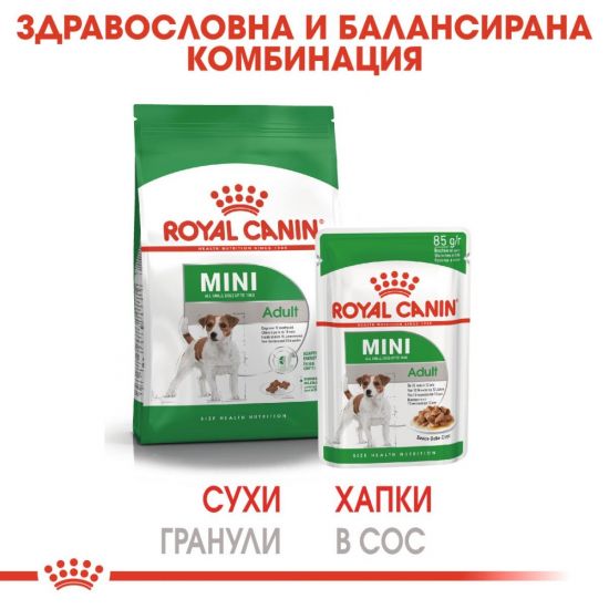 ROYAL CANIN® Mini Adult в сос е специално формулирана с всички хранителни вещества за вашето куче от дребна порода.
