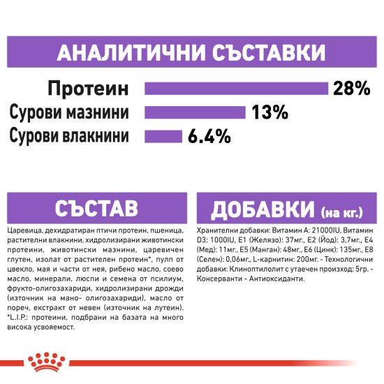 СЪСТАВ: царевица, дехидратиран птичи протеин, пшеница, растителни влакнини, хидролизирани животински протеини, животински мазнини, царевичен глутен, изолат от растителен протеин*, пулп от цвекло, мая и части от нея, рибено масло, соево масло, минерали, люспи и семена от псилиум, фрукто-олигозахариди, хидролизирани дрожди (източник на мано- олигозахариди), масло от пореч, екстракт от невен (източник на лутеин).
