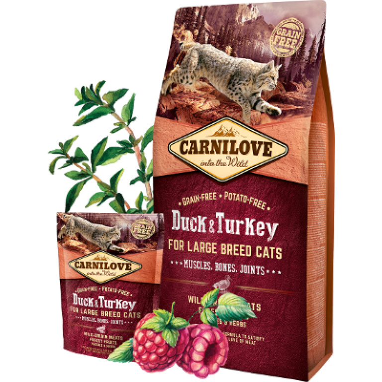Carnilove Duck&Turkey Large breed е балансирана храна без зарна и картофи,предназначена за големи породи котки като мейн куун, американски бобтейл, регдол, сибирска котка, норвежка котка..