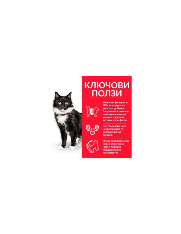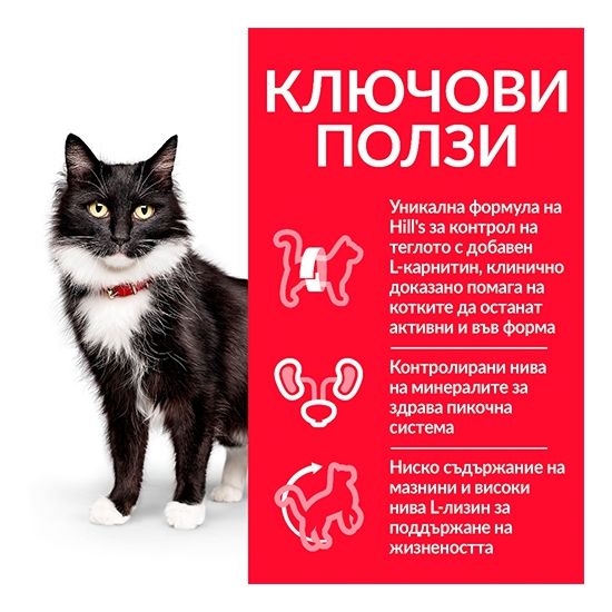 - Уникална формула на Hill’s за контрол на теглото с L-карнитин, клинично доказано спомагаща за запазване на здравословно тегло и активността