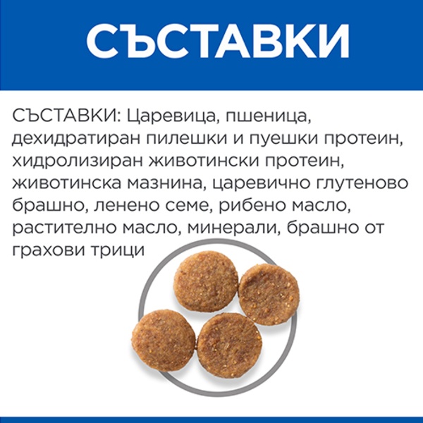 СЪСТАВ: Царевица, пшеница, дехидратиран пилешки и пуешки протеин, хидролизиран животински протеин, животинска мазнина, царевично глутеново брашно, ленено семе, рибено масло, растително масло, минерали, брашно от грахови трици.