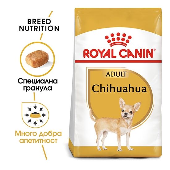 Подходяща за чихуахуа над 8 месеца, ROYAL CANIN® Chihuahua Adult е специално формулирана с всички необходими хранителни вещества за вашето куче в зряла възраст. Храната ROYAL CANIN® Chihuahua Adult е много вкусна и задоволява капризния апетит дори на най-капризните кучета от порода чихуахуа, благодарение на комбинацията от три фактора: