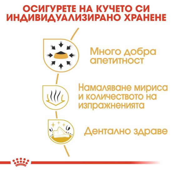 • Използване на подбрани вкусови качества Какво още? Хранителните вещества в ROYAL CANIN® Chihuahua Adult подпомагат храносмилателната функция на вашето куче, което от своя страна води до намален обем на изпражненията и намаляване на миризмата им. За да подпомогне денталното здраве на чихуахуа, ROYAL CANIN® Chihuahua Adult съдържа калциеви хелатори, които помагат за забавяне образуването на зъбен камък. За да отговори на индивидуалните препочитания на всяко куче, ROYAL CANIN® Chihuahua Adult се предоставя и в мокър вариант – мек и вкусен пастет. Ако обмисляте смесено хранене следвайте препоръките за хранене, за да сте сигурни, че кучето ви получава точното количество суха и мокра храна за оптимално здраве.