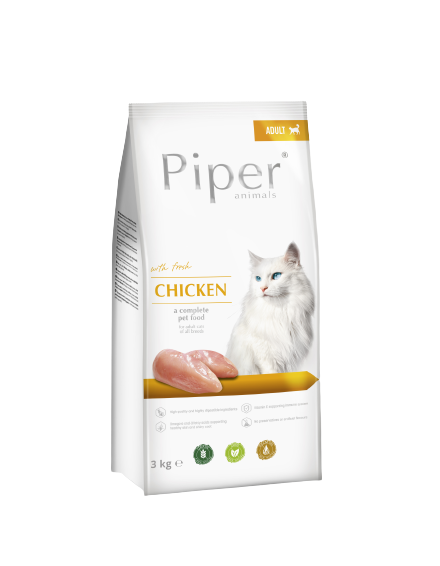 Piper Cat , с пиле отговаря напълно на хранителните изисквания на котката. , Балансираният му състав означава, че може да се използва като единствена храна в ежедневната му диета, без да е необходимо добавяне и допълване с други храни. , Източници на висококачествени протеини и мазнини са месото и животинските продукти, включително пилешкото месо. , Птичите мазнини са източник на полиненаситени мастни киселини от семейство n-6, регулира работа на сърцето и нервната система. Осигурява се правилно функциониране на храносмилателния тракт. , Правилното съотношение на калций и фосфор гарантира ефективно функциониране на скелетната система. , Сухата храна с пиле от , Piper Cat Chicken , покрива търсенето на необходимия за котката таурин,  , което съответства, наред с други , за забавяне на процеса на стареене на тялото.
