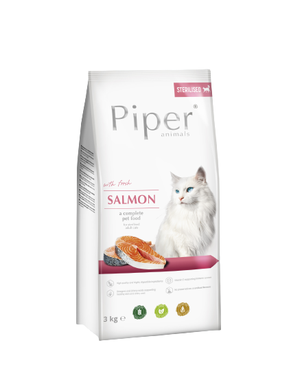 Piper Cat Salmon , съдържа висококачествени , протеини и мазнини, които са , основните хранителни вещества в диетата на котката. , Piper Cat , суха храна със сьомга за кастрирани, благодарение на съдържанието на месо и животински продукти, включително прясна сьомга, покрива нуждите на кастрирана , котка от вещества, необходими в ежедневното хранене. , Един от тях е , таурина, който има антиоксидантни, т.е. свойства против стареене. , Сьомговото масло е ценен източник на полиненаситени мастни киселини от семейство n-3, които подобряват външния вид на кожата и козината и регулират сърдечно-съдовата система. , Добавянето на екстракт от Mojave yucca, поради наличието на диетични фибри, стимулира секрецията на храносмилателни сокове, което подобрява метаболизма. , Съставът на храната включва хранителни вещества, необходими за поддържане здравето и доброто състояние на котката.