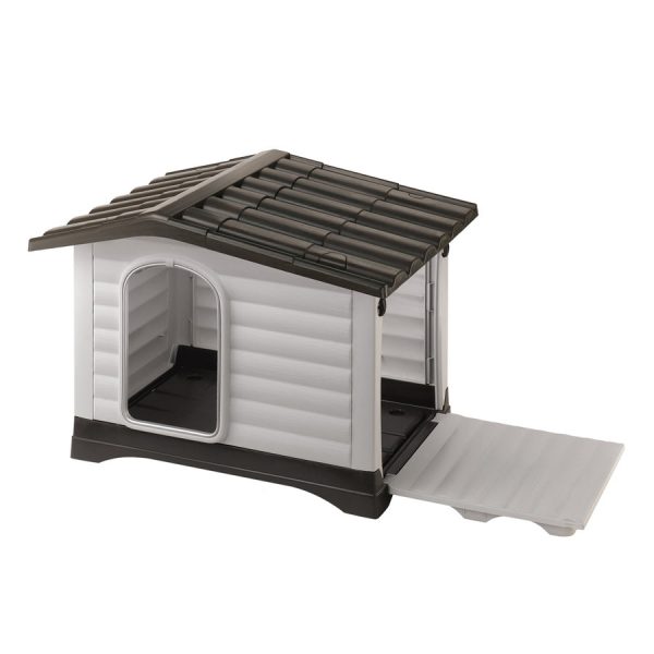 Изработена от здрава термопластична смола, устойчив на удари и UV лъчи материал, Dogvilla е развъдник за кучета на открито, оборудван със система за отваряне от страничната стена (патентована). Отварящият панел може да се монтира отдясно или отляво. Веднъж отворена, тя се превръща в удобна платформа, лежаща на земята, давайки на вашето куче много повече пространство. Идеален за всички сезони, затворен през зимата или отворен през лятото, развъдникът Dogvilla е оборудван с вентилационна система, която осигурява отлична вътрешна вентилация, избягвайки образуването на влага, като по този начин гарантира суха среда през цялото време; основата е проектирана със специални слотове, които позволяват на водата да изтича от кошарата.