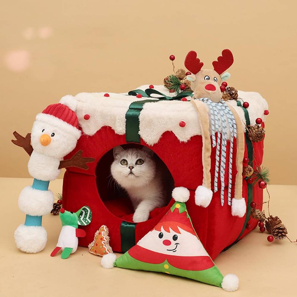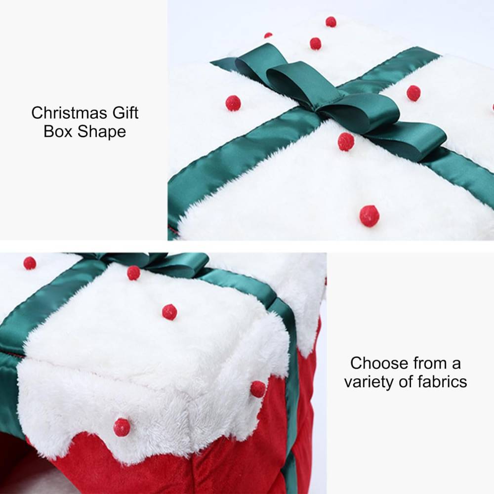 Коледно легло за дребни домашни любимци, проектирано във формата на опакован коледен подарък. В класически коледни цветове- зелено, червено и бяло, което би било детайл от коледна украса на всеки дом.