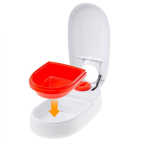 Дори когато не сте вкъщи, Cometa ще се погрижи за всичко! Този автоматичен дозатор за храна за кучета и котки ще осигури точното количество храна на Вашия домашен любимец в точно определеното време. Купата Cometa е снабдена с таймер за лесно програмиране на нейното отваряне до 44 часа. Той е идеален за малки кучета и котки, има вместимост 0,4 литра и е подходящ за суха храна. Ако трябва да осигурите двойно хранене в различно време, можете да свържете два дозатора заедно с помощта на предоставената специална табела за свързване. Cometa е изработен от здрава пластмаса и има стабилна основа, поддържаща се от гумени крачета. Почистването става лесно, благодарение на подвижната купа, която може да се изважда и мие като всяка нормална купа. Докато дозаторът може да бъде почиствен само с мокра кърпа. Как насърчаваш своя пухкав приятел да използва Cometa? Има няколко прости сюжета, които можете да използвате! Препоръчително е да привикнете домашния си любимец към разпределителя, докато присъствате. След като той свикне с него, можете да продължите да го програмирате. Обикновено котките се нуждаят от повече време, за да свикнат, докато кучетата трябва да бъдат наблюдавани през първия период на употреба, тъй като могат да повредят продукта. Съветваме ви да започнете да използвате дозатора като нормална купа. Не използвайте таймера веднага. За да работи продуктът, уверете се, че използвате една 1,5 V алкална батерия AAA LR03 (батерията не е включена в комплекта). Не използвайте акумулаторни батерии. Вместимост: 0,4L; Размери: 13,2 x 23,7 x h 7,5 cm.