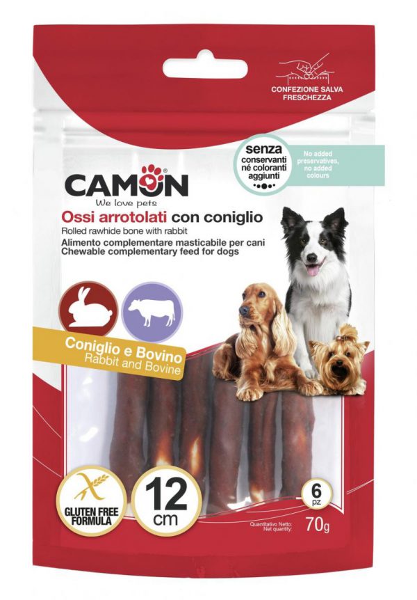 Куче Лакомства за кучета Дентални лакомства Camon Ролки от кравешка кожа със заек 70 G