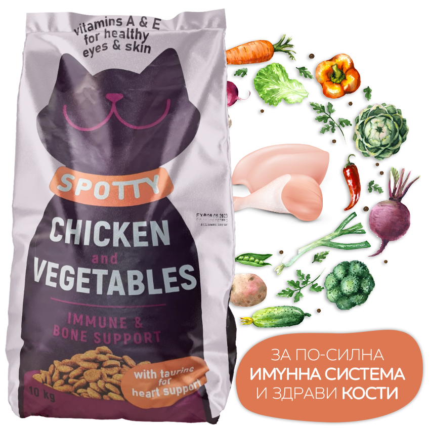 Сухата храна за котки с пилешко и зеленчуци им осигурява едно балансирано хранене. Пилешкото месо е богато на таурин, аргинин, валин, витамини А, B, C, E, F.