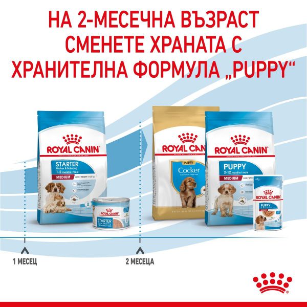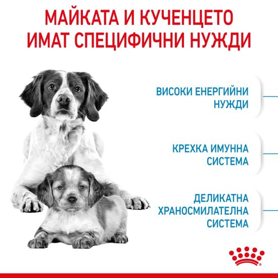 ROYAL CANIN® Medium Starter Mother & Babydog е специално формулирана за удовлетворяване на хранителните потребности на новите майки и техните кученца. Тази формула е подходяща за кучета от средни породи в зряла възраст (тегло между 11 и 25 кг), както и за кученца в периода на отбиване до 2 месеца.