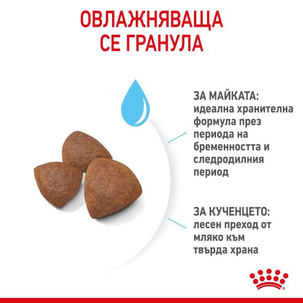 Гранулите в ROYAL CANIN® Medium Starter Mother & Babydog лесно се овлажняват с вода за получаването на апетитна консистенция подобна на каша, която е идеална за отбиваните кученца.