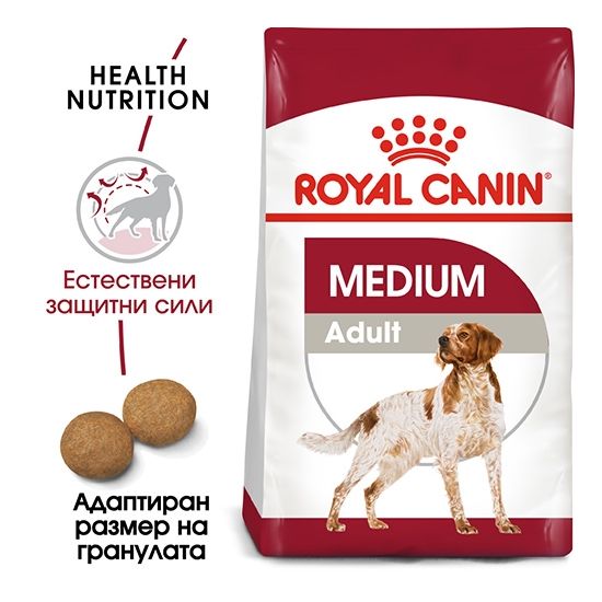 На 12 месеца вашето куче от средна порода е вече достигнало своята зрялост по отношение на неговия физиологичен растеж. Доброто хранене през този етап от живота е също толкова важно, колкото и периода на растеж. Подсигуряването на правилните хранителни вещества в точните количества чрез храната на вашето куче е основно за поддържането на неговото добро здраве. ROYAL CANIN® Medium Adult е специално формулирана към хранителните нужди на кучета от средни породи и е подходяща за кучета от 1 до 7 години с тегло в зряла възраст от 11 до 25 кг. Храната ROYAL CANIN® Medium Adult съдържа антиоксидантен комплекс, както и хранителни вещества като мано-олигозахариди за подпомагане на естествените защитни сили и позволява поддържане на здрав начин на живот. ROYAL CANIN® Medium Adult подпомага оптималното храносмилане, което позволява вашето куче да абсорбира ефективно хранителните вещества. Какво повече? Балансираното съдържание на диетични фибри подпомага здравословното храносмилане на вашето куче. ROYAL CANIN® Medium Adult е обогатена на омега- 3 мастни киселини, като ЕПА и ДХА, за подпомагане на здравата кожа и козина.