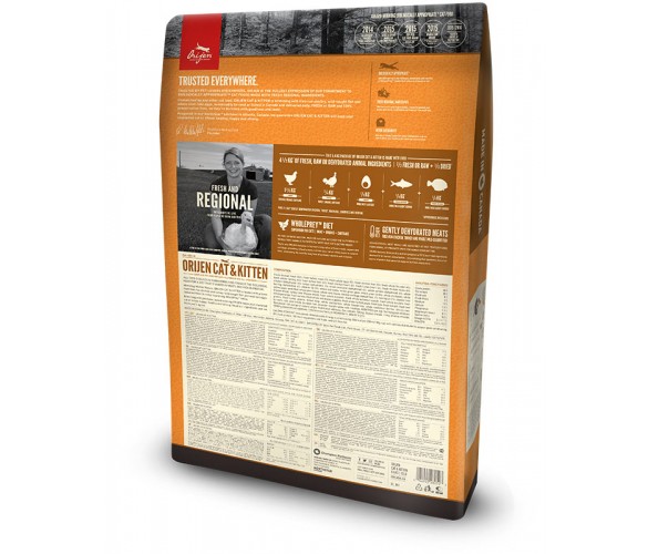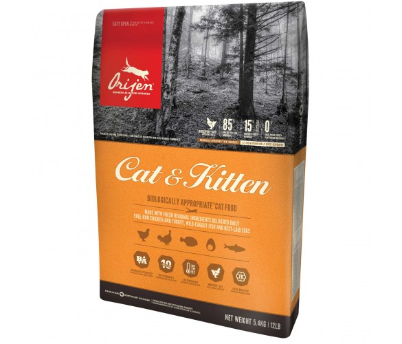 · ОГРАНИЧЕНО КОЛИЧЕСТВО ВЪГЛЕХИДРАТИ Въпреки че, котките нямат нуждата от въглехидрати, комерсиалните храни съдържат голямо количество от високогликемични въглехидрати, като картофи, ориз, нишесте и тапиока, които често са водеща причина за затлъстяване и диабет. Ето защо ORIJEN ограничава общото количество въглехидрати и заменя бързо разградимите въглехидрати със здравословни, ниско-гликемични плодове и зеленчуци. Храната ORIJEN се произвежда в собствената фабрика NORTH STAR на Champion Pet Foods в Канада, където се контролира всеки етап от производството – откъде и как са отгледани вложените ингредиенти, до разработване състава на храната и пакетирането й, спазвайки стриктни здравни норми и процедури за безопасност. ORIJEN CAT & KITTEN (за малки котенца и котки от всички породи)