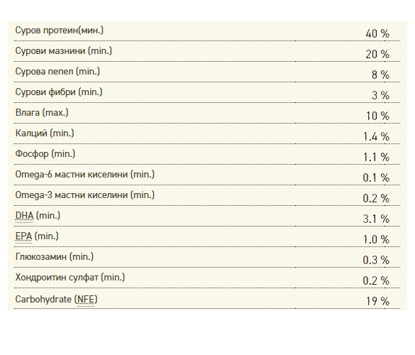 ДОБАВКИ: Цинков хелат, меден хелат, холин. ЕНЕРГИЙНА ЦЕННОСТ И РАЗПРЕДЕЛЕНИЕ: Метаболитната Енергия е 4160 kcal/kg (540 kcal за 250мл/120g чаша) като 39% от енергията е от протеин, 43% от мазнини и 18% от плодове и зеленчуци.