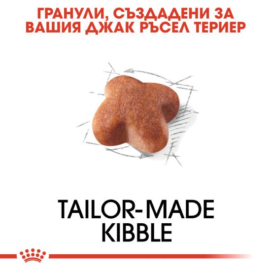 Специална форма на гранулата: Формата, размерът и текстурата на гранулата са специално адаптирани за челюстта на джак ръсел териера.