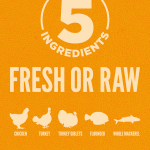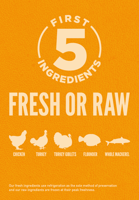 прясно пилешко (23%) (обезкостено), сушено пилешко (17%), прясно уловена сьомга (9%) (обезкостена), сушено пуешко месо, сушена херинга (6%) (обезкостена), задушени червени картофи, грах, сладки картофи, прясно пуешко (3%) (обезкостено), пресни яйца (3%), пилешки дроб (2%), прясно уловена треска (2%), прясно уловена бяла риба (2%), сушена на слънце люцерна, грахови фибри, пилешка мазнина(2%), водорасли, тиква, цикория, моркови, спанак, ябълки, червени и черни боровинки, сладък корен, корен от ангелика, сминдух, цвят от невен, сладък корен, резене, листа от мента, лайка, глухарче, розмарин, Lactobacillus acidophilus, Enterococcus faecium.