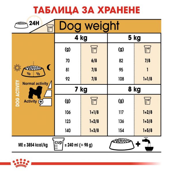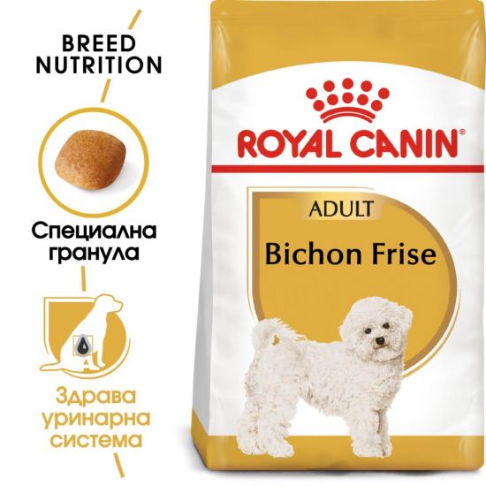 Подходяща за кучета над 12 месеца, ROYAL CANIN® Bichon Frise Adult е специално формулирана за всички хранителни нужди на вашето куче порода френска болонка в зряла възраст. Адаптираната комбинация на подходящи хранителни вещества в тази формула помага за поддържане здарвето на уринарната система. ROYAL CANIN® Bichon Frise Adult е с адаптирано минерално съдържание, но подсигурете да поощрявате вашето куче да пие по-често вода като това ще подпомогне здравето на уринарната система. ROYAL CANIN® Bichon Frise Adult е обогатена на поречово масло и омега- 3 мастни киселини (ЕПА и ДХА), за подпомагане на бариерната функция на кожата, която допринася за общото състояние на кожата. ROYAL CANIN® Bichon Frise Adult помага на вашето куче да поддържа идеално телесно тегло. Какво още? Адаптираната гранула на ROYAL CANIN® Bichon Frise Adult е специално създадена с калциеви хелатори за забавяне формирането на зъбен камък. Това допринася за общото дентално здраве на вашето куче.