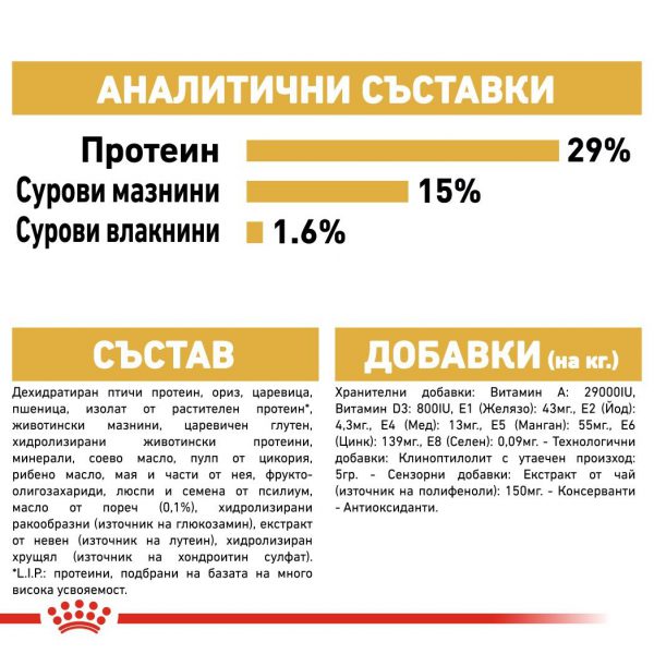 СЪСТАВ: Състав: дехидратиран птичи протеин, ориз, царевица, пшеница, изолат от растителен протеин*, животински мазнини, царевичен глутен, хидролизирани животински протеини, минерали, соево масло, пулп от цикория, рибено масло, мая и части от нея, фрукто-олигозахариди, люспи и семена от псилиум, поречово масло (0, 1%), хидролизирани ракообразни (източник на глюкозамин), екстракт от невен (източник на лутеин), хидролизиран хрущял (източник на хондроитин).