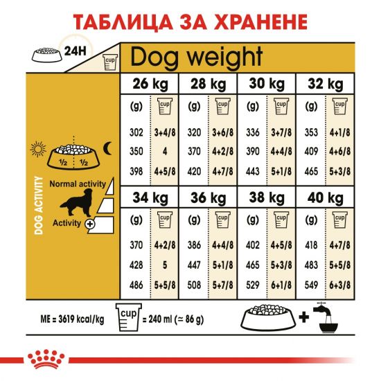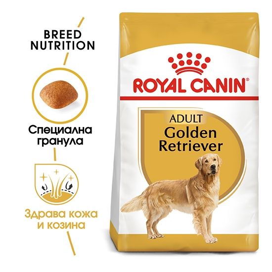 Подходяща за кучета над 15-месечна възраст, ROYAL CANIN® Golden Retriever Adult е специално формулирана според хранителните нужди на вашето куче в зряла възраст. ROYAL CANIN® Golden Retriever Adult съдържа омега-3 мастни киселини, включително ЕПА и ДХА и поречово масло. Тези хранителни вещества подпомагат за поддържане на бариерната функция на кожата, което от своя страна допринася за здравословния вид на козината на вашето куче. Благодарение на комбинацията от мастни киселини и обогатената с таурин формула, ROYAL CANIN® Golden Retriever Adult допринася за здрава сърдечна функция.ROYAL CANIN® Golden Retriever Adult има адаптирано сърържание на калории, което подпомага поддържането на идеално телесно тегло. Какво още? Гранулите ROYAL CANIN® Golden Retriever Adult са специално създадени за кучета от породата голдън ретривър. Формата и размера на гранулата са специално адаптирани според предпочитанията на тази порода.