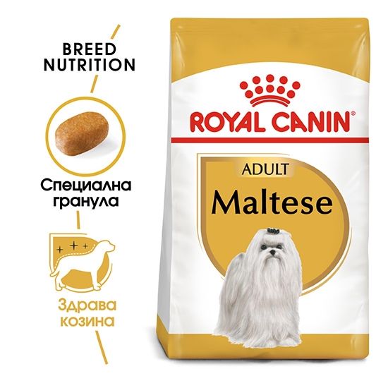 Подходяща за кучета порода малтийска болонка над 10 месеца, ROYAL CANIN® Maltese Adult е специално формулирана за всички хранителни нужди на вашето куче в зряла възраст. Храненето е важно за здравето на кожата и козината – поради тази причина ROYAL CANIN® Maltese Adult съдържа специално адаптирани хранителни вещества, включително омега-3 мастни киселини, за да запазят козината на вашата малтийска болонка гладка и красива. Малтийските болонки са особено изискващи по отношение на тяхната храна. Те изискват много апетитна храна и ROYAL CANIN® Maltese Adult помага да се задоволи дори най- капризният апетит, благодарение на комбинацията изключителни вкусове, на които вашето куче не може да устои! Какво още? ROYAL CANIN® Maltese Adult помага за намаляване на фекалната миризма и обема на изпражненията, защото неговата формула съдържа хранителни вещества, които подпомагат храносмилателната система на вашето куче. Малтийските болонки имат фина челюст със силни широки зъби. Кучетата от дребни породи имат пропорционално по- малко кости за подпомагане на кътниците, отколкото едрите кучета и затова е важно храната на вашето куче да подпомага денталното здраве. Благодарение на включването на калциеви хелатори, гранулата на ROYAL CANIN® Maltese Adult помага за поддържане денталната хигиена на вашето куче чрез забавяне формирането на зъбен камък.