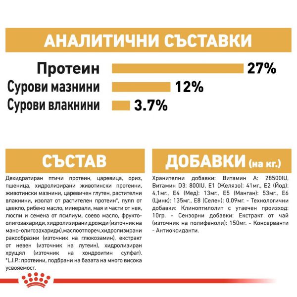 СЪСТАВ: Състав: дехидратиран птичи протеин, царевица, ориз, пшеница, хидролизирани животински протеини, животински мазнини, царевичен глутен, растителни влакнини, изолат от растителен протеин*, пулп от цвекло, рибено масло, минерали, мая и части от нея, люспи и семена от псилиум, соево масло, фрукто- олигозахариди, хидролизирана мая (източник на мано- олигозахариди), поречово масло, хидролизирани ракообразни (източник на глюкозамин), екстракт от невен (източник на лутеин), хидролизиран хрущял (източник на хондроитин сулфат).