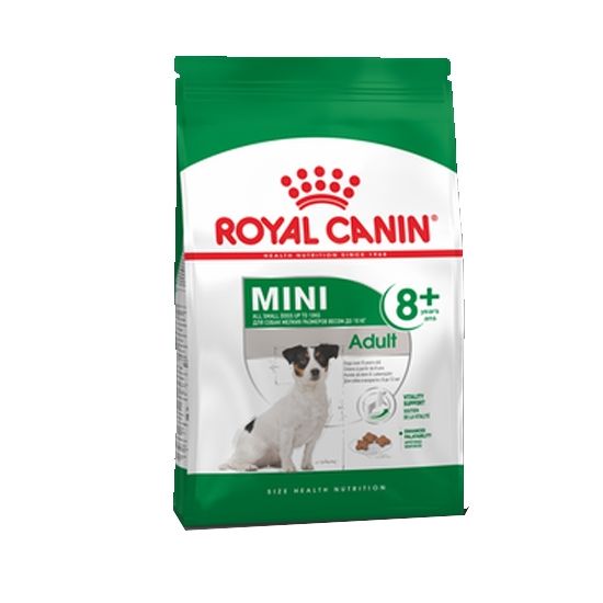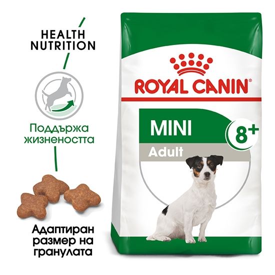 ROYAL CANIN® Mini Adult 8+ е подходяща за дребни кучета над 8 години с тегло в зряла възраст до 10кг. Тази храна е формулирана всички хранителни нужди на кучетата от дребни породи. Тази формула е със специално адаптирано съдържание на хранителни вещества, които помагат за поддържането на жизнеността при дребните кучета като вашето, и които се срещат с първите признаци на остаряването. Някои дребни породи кучетата проявяват признаци на капризен апетит. Ако това се отнася и за вашето куче тогава може да сте сигурни, че ROYAL CANIN® Mini Adult 8+ е формулирана с правилният подбор специални вкусови качества. Добрите вкусови качества на храната означават, че храната може да задоволи капризният апетит дори на най-претенциозните кучета! Какво още? Адаптираното съдържание на енергия в ROYAL CANIN® Mini Adult 8+ помага на дребните породи като вашето да поддържат здравослосно тегло. Дребните породи кучета са предразположени към високи енергийни нужди и високоенергийното съдържание на тази храна отговаря на тази нужда на вашето куче и начин на живот като поддържа здравословното му тегло.