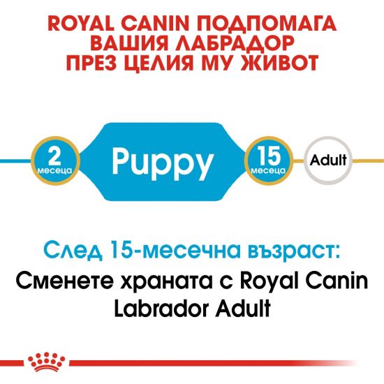 Подходяща за кученца до 15-месечна възраст, ROYAL CANIN® Labrador Retriever Puppy е специалнo формулирана и съобразена с хранителните нужди на подрастващото кученце от породата лабрадор ретривър. Имунната система на малкото кученце от породата лабрадор ретривър се развива постепенно, формулата ROYAL CANIN® Labrador Retriever Puppy помага за поддържане на естествените защитни сили на кученцето, по време на този важен период, благодарение на антиоксидантния комплекс, включващ и витамин Е. Благодарение на адаптираното съдържание на енергия, протеини, калций и фосфор, ROYAL CANIN® Labrador Retriever Puppy допринася за правилното развитие на костната структура на подрастващото кученце. Храната също помага и за контролиране хармоничното наддаване на тегло, което благоприятства поддържането на идеално телесно тегло при подрастващите кученца. ROYAL CANIN® Labrador Retriever Puppy съдържа комбинация от хранителни вещества с висококачествени протеини (L.I.P*) и пребиотици (фрукто- олигозахариди) за подпомагане на храносмилателното здраве и баланса на чревния микробиом. Какво още? Храната помага и за добро качество на изпражненията. Гранулата на ROYAL CANIN® Labrador Retriever Puppy е адаптирана и специално разработена за кученца порода лабрадор ретривър. Формата и размерът на гранулата улесняват кученцето при поемане на храната и нейното сдъвкване, докато консистенцията ѝ стимулира вкусовите качества.