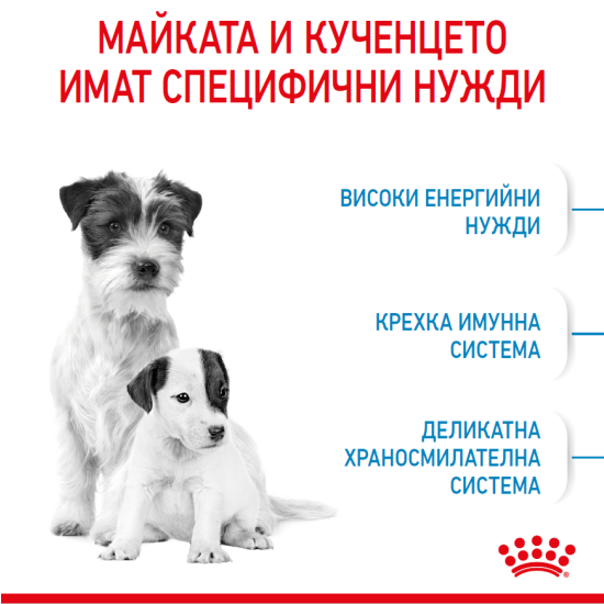 ROYAL CANIN® Mini Starter Mother & Babydog е обогатен с омега-3 мастни киселини за подпомагане на здравословното развитие на мозъка при малки кученца.