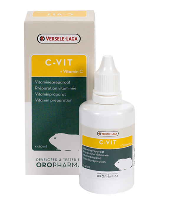 Oropharma C-Vit – допълнителна храна за морски свинчета – мултивитаминна смес с допълнителен витамин С. Мултивитаминна смес с допълнителен витамин С за морски свинчета. Специално за морски свинчета, които не могат да произведат сами витамин С. Обогатен с L-карнитин, който помага за поддържането на теглото. Стимулира общото здраве и естествената резистентност. Състав: декстроза, течен сорбитол. Добавки/кг: хранителни добавки: a300 витамин С (аскорбинова киселина): 88689mg, 3a672 витамин A (ретинил ацетат): 3904961 IU, 3a671 витамин D3 (холекалциферол): 177377 IU, 3a700 витамин E (ал-рак-токоферил ацетат): 4520 мг, 3a820 витамин В1 (тиамин хидрохлорид): 316 мг, 3a825i витамин В2 (рибофлавин): 399 мг, 3a841 калциев D-пантотенат: 355 мг, 3a831 витамин В6 (пиродоксин хидрохлорид): 438 мг, 3a710 витамин К (менадион): 111 мг, 3a314 ниацин (витамин PP): 177mg, 3a316 фолиева киселина: 177mg, 3a880 биотин: 35mg, витамин B12 (цианобаламин): 0,044mg, 3a910 L-карнитин: 6093mg.