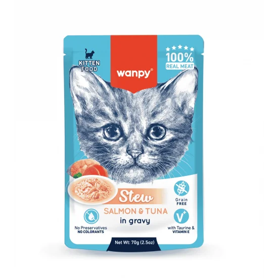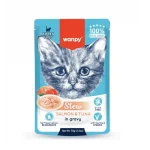 Wanpy Stew in gravy пауч за котки със сьомга и риба тон 70 г / 10 бр. СТЕК. Допълваща храна за котки.